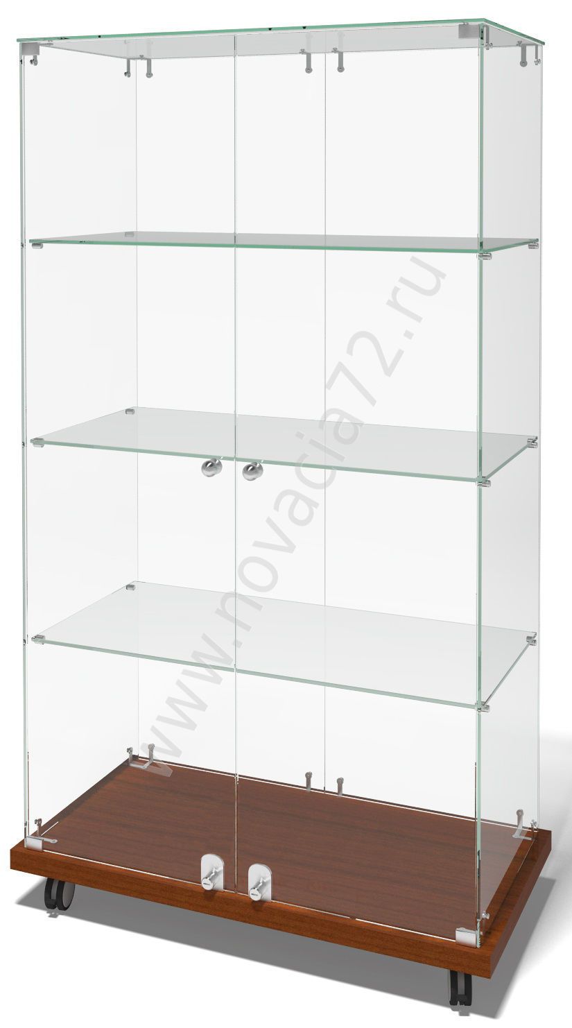 Основание стеллажа выполнено из ЛДСП. Стенки, крышка, 2 дверцы с замками и 3 полки изготовлены из стекла марки М1.