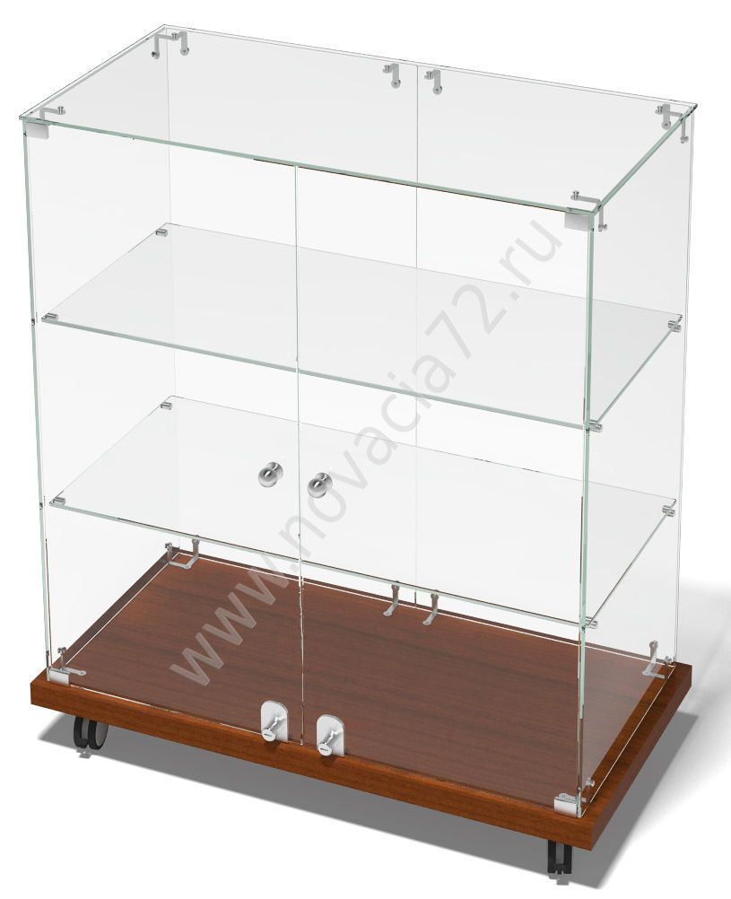 Витрина оснащена 3-мя отделениями. Прямоугольное основание выполнено из ЛДСП. Корпус, 2 дверцы с замками и 2 полки изготовлены из стекла марки М1.