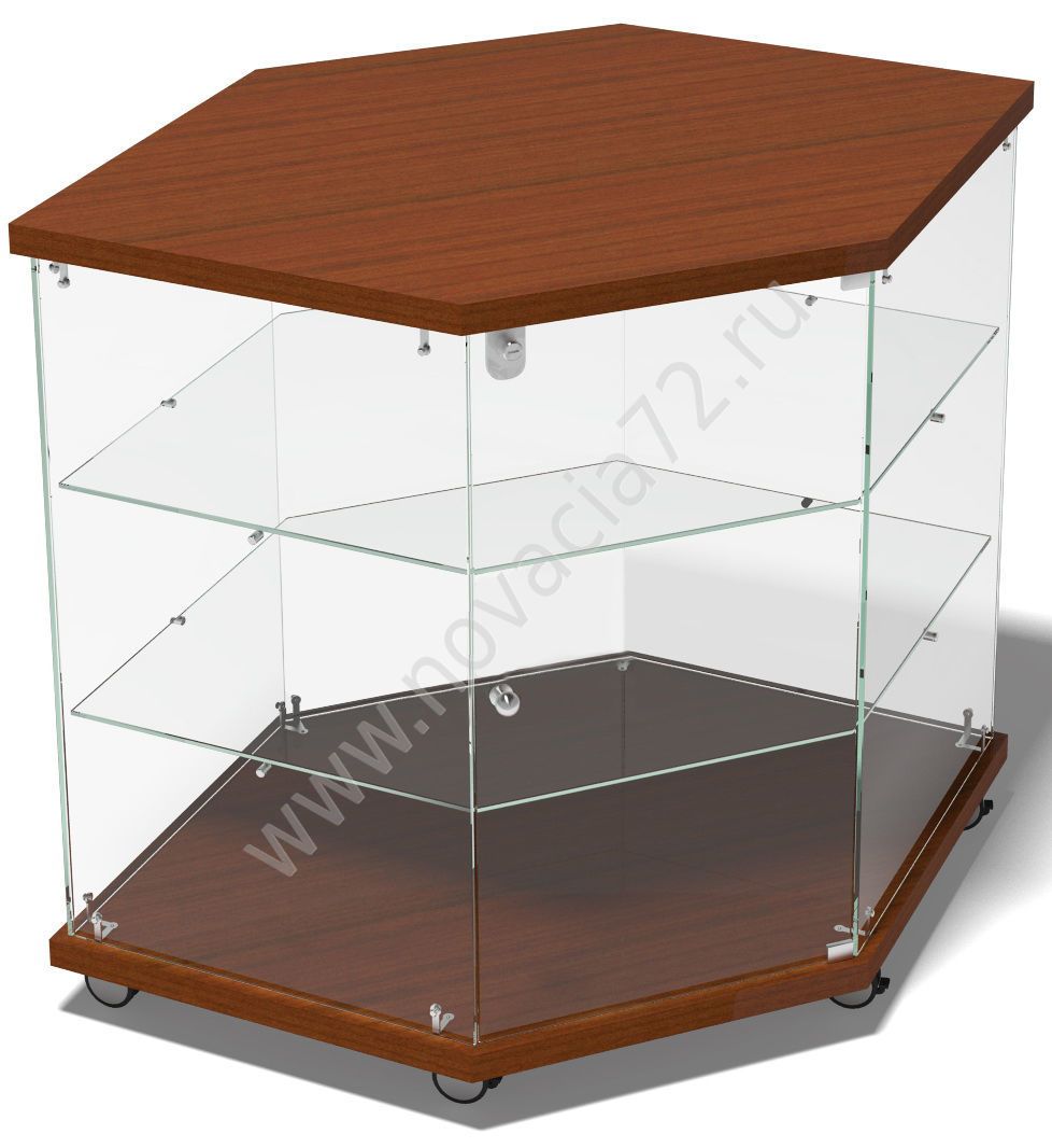 Витрина оснащена 2-мя прозрачными полками, дверцей, боковыми стенками из стекла марки М1. Основание и крышка выполнены из ЛДСП.