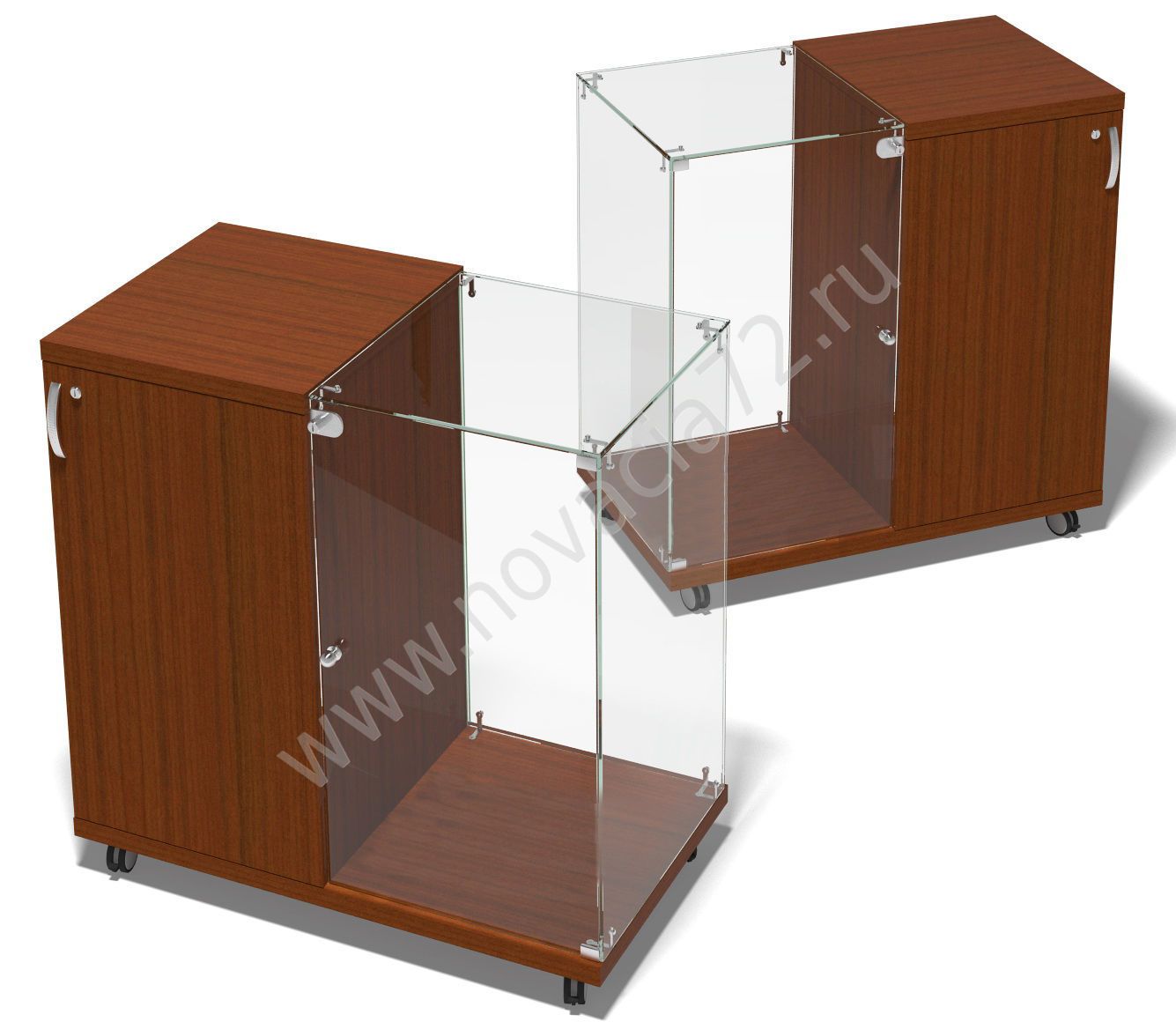 Витрина представлена 2 вертикальными секциями: из стекла марки М1 и из ЛДСП. Оба прямоугольных отсека оснащены дверцами, которые запираются на замок.