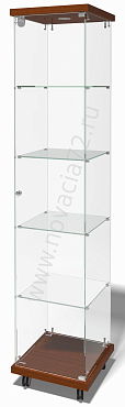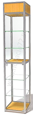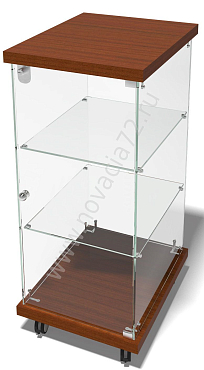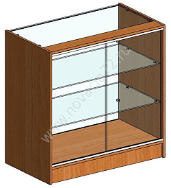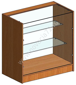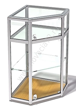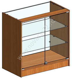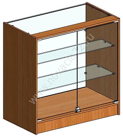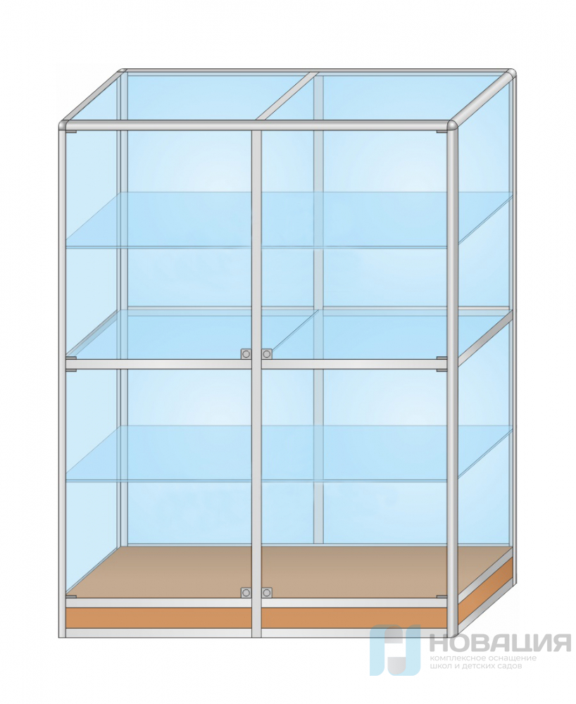 В стеллаже с прозрачными стенками и дверцами с замками хранится наглядный материал, образцы творческих работ или награды. Для экспонатов выделено 4 отсека. Полки выполнены из стекла 5 мм, отшлифованного по краям. У подиума полка выполнена из ЛДСП, а стенки-из ХДФ, h 150 мм.