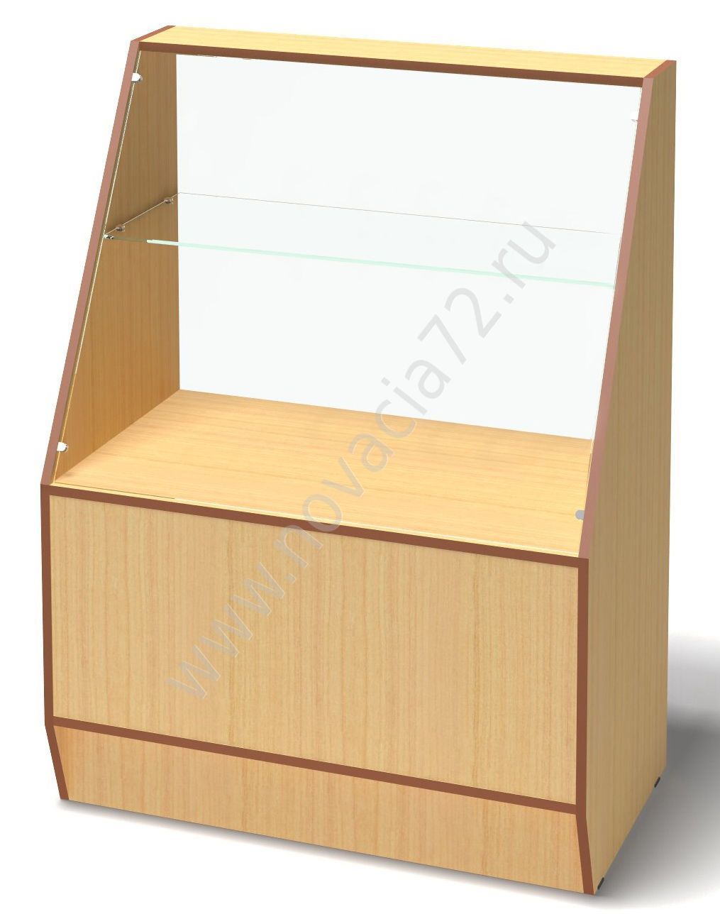 В демонстрационной витрине можно хранить награды, выставочные экземпляры книг, рисунки или поделки. Для этого предусмотрена стеклянная полка. Фасад прозрачный, с наклонной поверхностью. Глухая нижняя часть мебели оснащена цоколем.