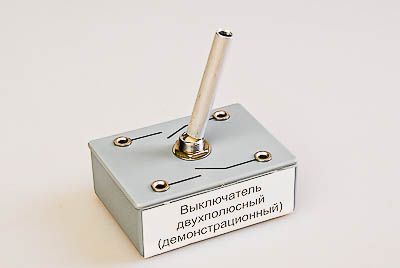 Прибор для лабораторных работ по физике состоит из пластиковой коробки с 4-мя клеммами и выключателем. На корпусе представлена схема для включения в цепь.