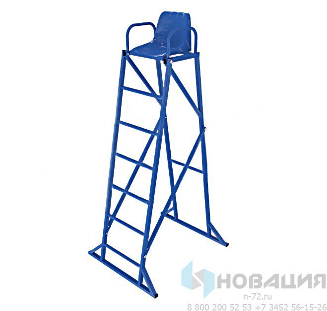 Судейская вышка на металлокаркасе подходит для командных игр. 4 стойки на полозьях укреплены поперечинами и диагональными перекладинами. Наверху кресло с высокими подлокотниками, к нему ведет лесенка.