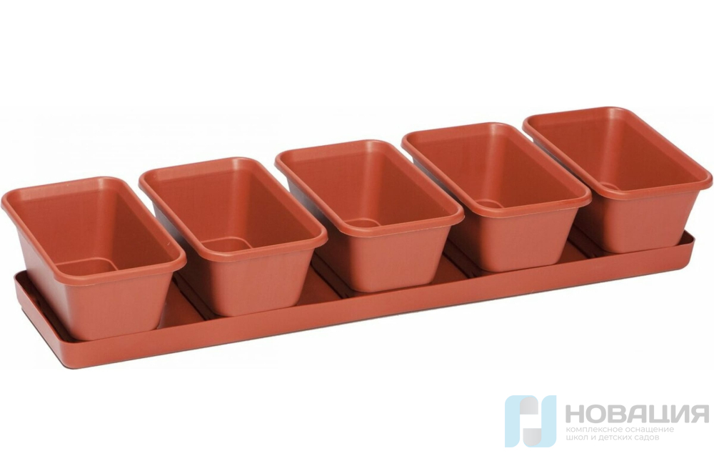 Ящик для рассады состоит из 5 частей с одним общим поддоном. Секции с высокими стенками оснащаются выгнутой наружу каймой. Бортики поддона не дают горшочкам выпасть за пределы ящика.