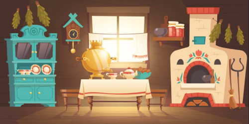 Занавес с изображением интерьера русской избы состоит из четырех полос шириной по 1500 мм. Соответствует размерам большинства сцен.