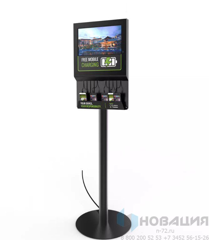 При помощи кабелей на пружинах осуществляется питание мобильных устройств. Одновременно с этим на экран выводятся объявления, указатели, презентационные тексты. Для подзарядки аккумулятора на 20% требуется от 15 минут, поэтому посетители успеют заинтересоваться контентом.