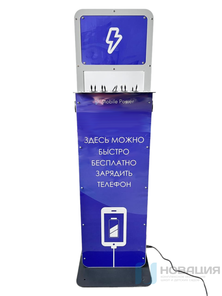 Напольная станция с 2-мя розетками (110-220 В) и кабелями USB заряжает электронные устройства в школах или других муниципальных учреждениях. Установка быстро справляется с задачей и экономит время на подготовку к занятию.