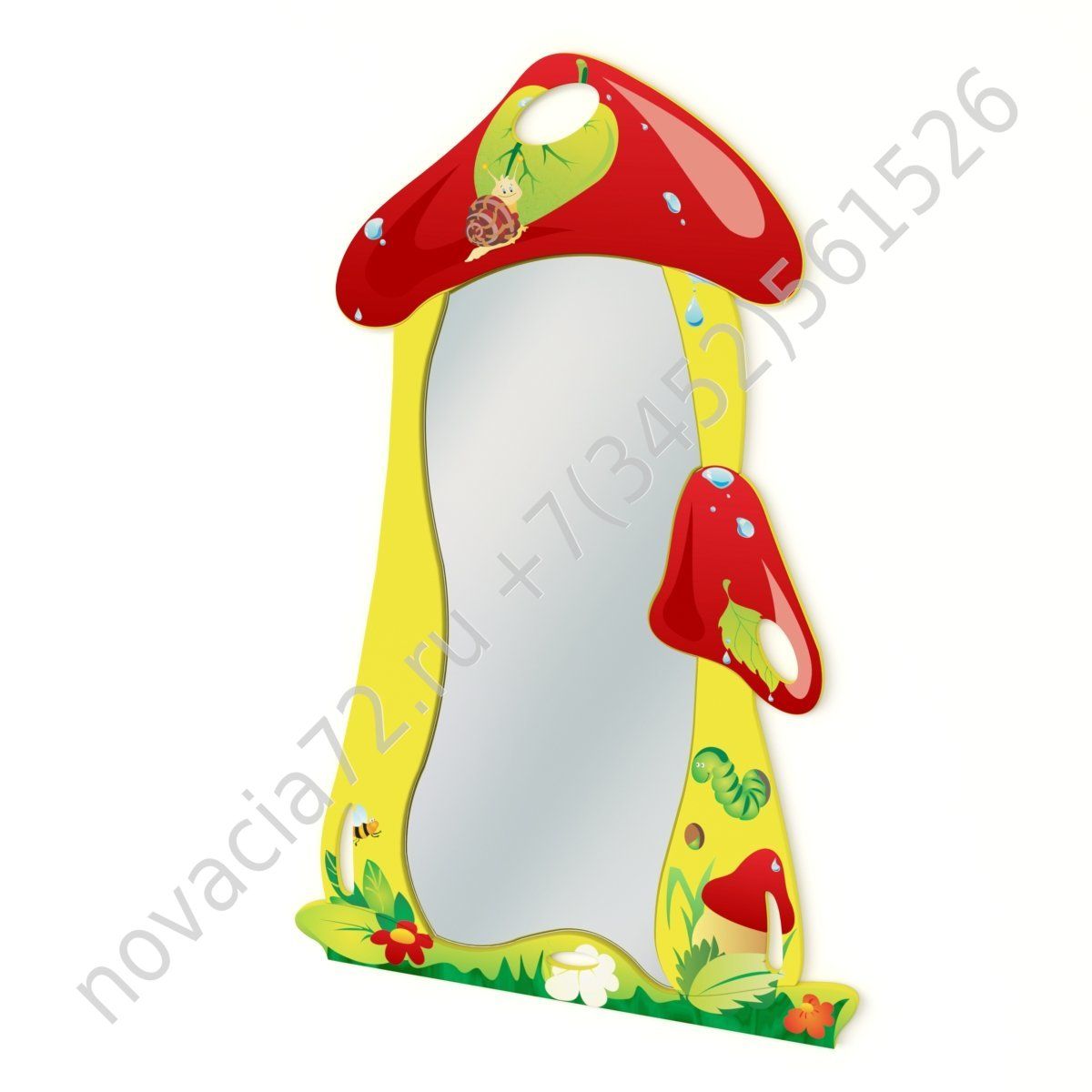 Конструкция состоит из отражающей поверхности и цветной декоративной оправы в виде грибов. Ударопрочные материалы и отсутствие острых углов позволяют избежать травм.