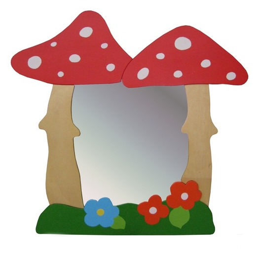 Зеркало в декоративном корпусе оснащено противоосколочной пленкой. По бокам изображены мухоморы. На оборотной стороне конструкции есть планки с металлическими навесами.