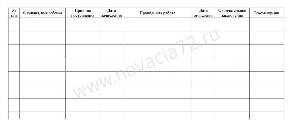 Данный журнал помогает взаимодействовать логопедам с детьми. В данном журнале прописываются основные данные ребенка: ФИО, причина поступления, проводимая работа, заключение, рекомендации.