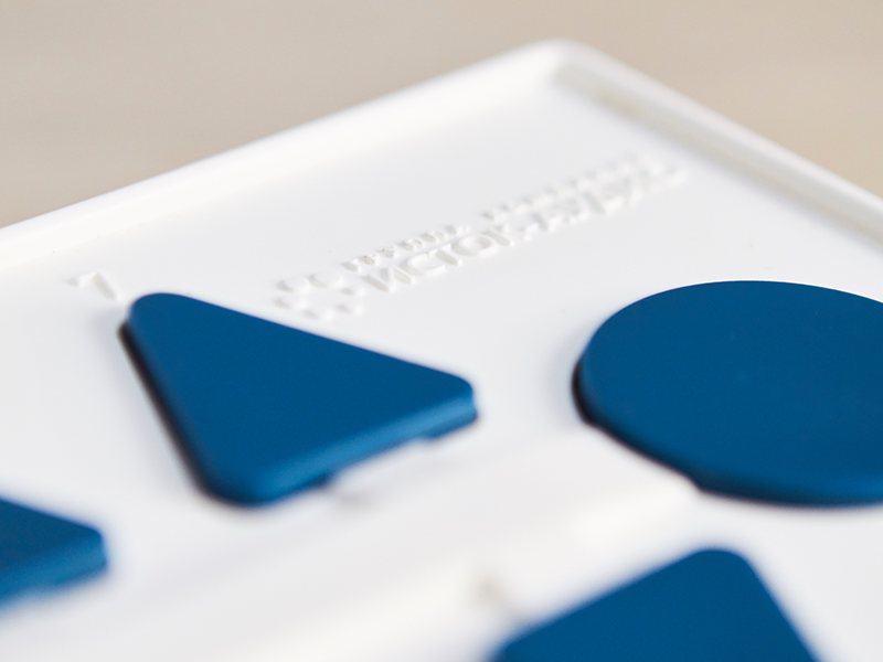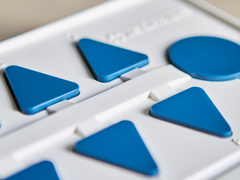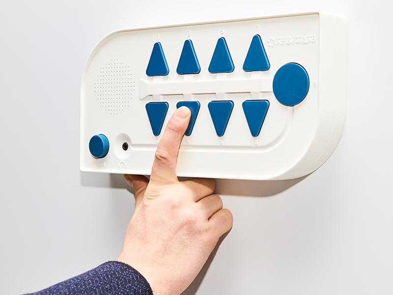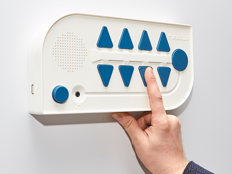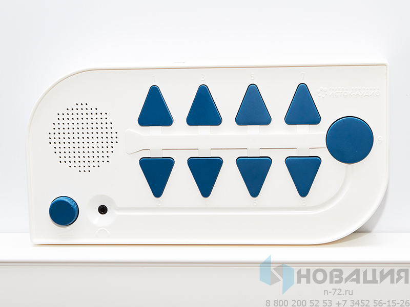 В пластиковый корпус с закрепленными углами и бортиками помещено устройство с громкоговорителем. По нажатию на рельефную кнопку выдается аудиосообщение. Чтобы узнать расписание, ребенок выбирает цифровое и буквенное обозначение учебной группы, день недели, порядковый номер занятия. ПО предоставлено пошаговым мастером настройки, работа с прибором не вызывает затруднений.