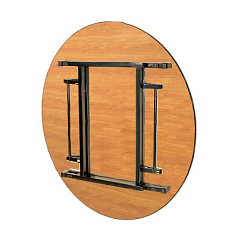 Пружинный механизм позволяет складывать ножки, раму и круглую столешницу в одну плоскость. 4 опоры дополнены колпачками. Пленка на столешнице имитирует рисунок ценной породы дерева.