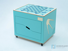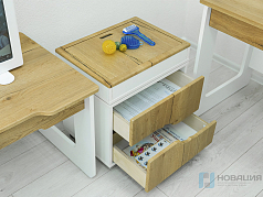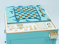 Стол для логопедических занятий оснащен зеркалом с подсветкой и рулонной шторой. Для пособий, инструментов и игр предусмотрены полка и выдвижной ящик.