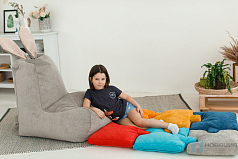 Бескаркасная конструкция состоит из 4 прямоугольников и 8 фигурок разных размеров и форм. Может собираться в диван, матрас или домик игр. Не имеет острых углов.