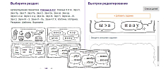 В базе 500 готовых упражнений. Педагог выбирает материалы для урока и определяет их порядок в конструкторе. Можно добавить свои указания. При необходимости пример выполнения отправляется на почту или вставляется в презентацию.