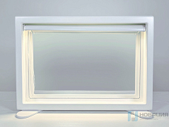 Зеркало можно размещать в любом удобном месте. Оснащено подсветкой и рулонной шторой, которая позволяет прикрыть зеркало, если оно не используется в данный момент.