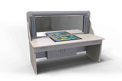 Стол имеет 2 рабочих места - для логопеда и ребенка. Оснащен сенсорным экраном и программным обеспечением для интерактивного обучения.