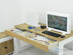 Тумба с подпятниками расположена справа под столешницей. Фасады оснащены фурнитурой. Дидактические материалы хранятся в ящиках или на полуоткрытых полках над столом.