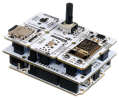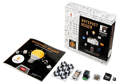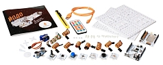 В комплекте: платформа Iskra JS, плата расширения Troyka Shield, потенциометр тактовая кнопка, ИК-приемник, ИК-пульт управления, зуммер, датчик освещенности, светодиод, термометр, сервопривод, дальномер ультразвуковой, 2 пластины, кабель USB, буклет.