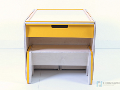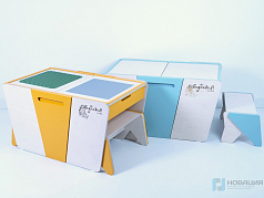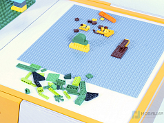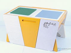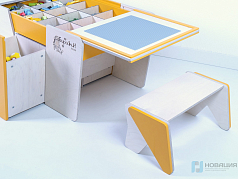 Стол предназначен для работы с конструкторами. Высокие бортики с закругленными углами предотвращают падение мелких деталей. Под столешницей расположены открытые полки для хранения, в нижней части конструкции - ящик с дверцей.