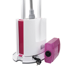 Компактный ручной отпариватель BRAYER BR4120 представлен в белом корпусе с контрастными фиолетовыми вставками. Устройство отличается функциональным дизайном. У отпаривателя есть удобный регулятор мощности и резервуар для 220 мл воды.