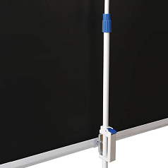 Монтаж заключается в установке треножного штатива, закреплении полотна и регулировке его положения с помощью рулонного механизма.