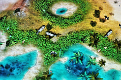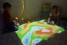 Ребенок сооружает из песка объекты, а проектор дополняет их эффектами (имитация природного ландшафта: гор, поверхности Марса и т.д.). Программа считывает движения рук.