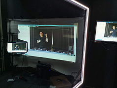 Прозрачная доска также имеет подсветку спикера, позволяет управлять отдельными элементами “в воздухе”. Для управления студией за кадром организовано отдельное место оператора.