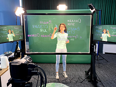 Студия предназначена для проведения онлайн-уроков и видеотрансляций с использованием камеры высокого разрешения (4K) и возможностью использования суфлёра. Доска с объем видеопамяти 6 гб с электроприводом имеет RGB LED подсветку стекла и LED подсветку спикера.