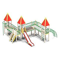 К башне с 2-хскатной крышей пристроены лестница и мост. Вторая башня прикрыта 6-тискатной крышей. Одно из фигурных ограждений дополнено иллюминатором. Внизу закрепляется игровая установка, с других сторон: лестница, горка и начало мостика. Полы и ступени конструкции не скользят. Защитная секция горки окружена аркой.