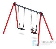Каркас окрашен порошковой краской, все швы тщательно обработаны. Наличие 2-х видов сидений позволяет использовать качели как совсем маленьким, так и детям постарше. Монтаж производится путем бетонирования, размер площадки должен быть не менее 3200х7000 мм.