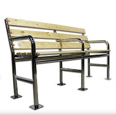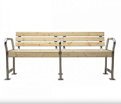 Металлический каркас из 3-х дугообразных опор с креплениями усиливается поперечными перекладинами. Сверху устанавливается прямоугольное деревянное сиденье. Доски из хвойных пород дерева обрабатываются для устранения дефектов. Металлические детали оцинковываются и покрываются порошковой краской.