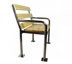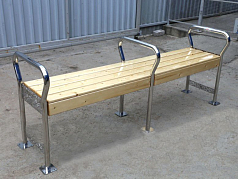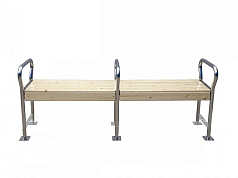 Прямоугольное сиденье из отшлифованных деревянных досок закрепляется на металлическом каркасе. Сдвоенные ножки из профильной трубы переходят в полозья.