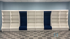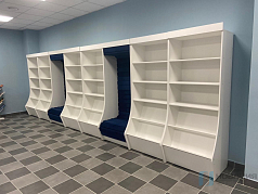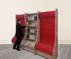 Посадочное место дополняет стеллаж для книг в современном информационно-библиотечном центре. Сиденье плавно переходит в спинку с наклонной верхней частью. Несколько стеллажей и посадочных мест формируют единый комплекс.