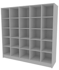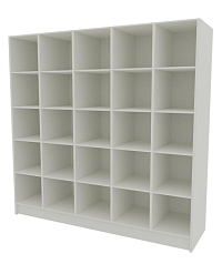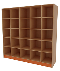 Прямоугольный корпус оснащен 25-ю ячейками по 5 в каждом ряду. Отделения вмещают разноформатные издания и таблички для выставки. Фасадная часть книжного шкафа для современной библиотеки внизу покрывается яркой пленкой ПВХ.