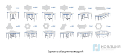 Комплект столов для проекта "ТР" составляется из 4-х модулей. Каждый модуль оборудуется каркасом с серыми металлическими ножками и подпятниками. D ножки составляет 40 мм. Части столешницы изготавливаются из 2-слойного ЛДСП, соединяются в круг. По центру композиции из вырезов образуется окружность.