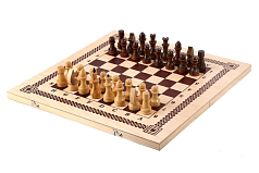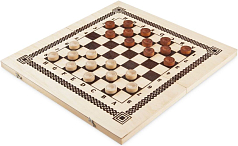 Размеры: 400х200х36 мм. Комплект игры: партия шахматных фигур обиходных, комплект шашек 24 шт.