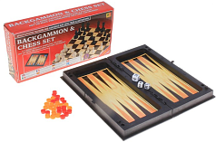 В набор входят: шахматы, шашки, нарды, фигуры, кости и игральная доска.