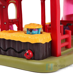 Игровая зона на 4-х металлических опорах представлена 2-мя закрытыми боксами, имитирующими духовку и кухонную тумбу, мойку со смесителем, имитацией конфорок, открытой нишей. Над столешницей закрепляется задняя вертикальная панель со скругленными углами, выполняющая роль бортика.