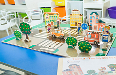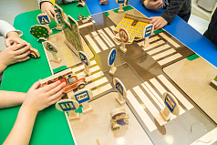 Макет представлен 2-сторонним полем с имитацией дороги и вспомогательными элементами. В комплекте устойчивые фигурки пешеходов и регулировщика, светофоров, машин (карета скорой помощи, пожарный и легковой автомобили), дорожных знаков, домов, деревьев, учреждений (детский сад, больница, школа). Набор воссоздает городскую инфраструктуру и помогает заучить правила поведения на улице. Основой для поля служит баннерное полотно.