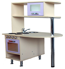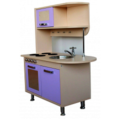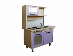 Игровая мебель для ДОУ стоит на 4-х опорах, представлена 2-мя нишами и 3-мя закрытыми боксами. Зона для сюжетно-ролевой игры позволяет воссоздать обстановку кухни с мойкой и смесителем, конфорками, духовкой. Детали 2-сторонней конструкции тщательно обработаны и дополнены хромированной фурнитурой.