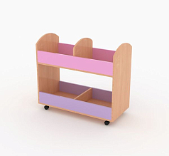 Тумба с 4-мя поворотными колесами подходит для хранения пособий, брошюр, детских игрушек и рисунков. Состоит из 2-х наклонных полок, каждая делится пополам вертикальной перегородкой. Боковых стенок нет. Углы панелей скруглены, поверхности отшлифованы. Торцы облицованы кромкой.