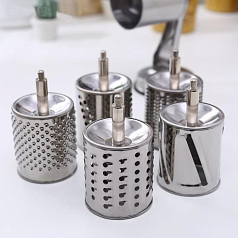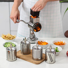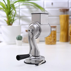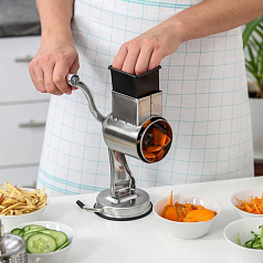 Ручной комбайн с 5-ю барабанами и вместительным дозатором используется на кухне. Для измельчения продуктов необходимо крутить ручку. Корпус изготовлен из нержавеющей стали. Крепеж вакуумный.