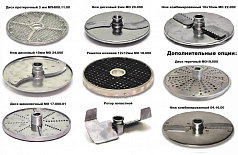 - представлен наиболее полный вариант комплектации модели: комбинированный нож (10х10 мм), 2 дисковых ножа (2 мм и 10 мм), шинковочный диск, ножевая решетка, ротор лопастной (закрепляется винтом), диск протирочный,