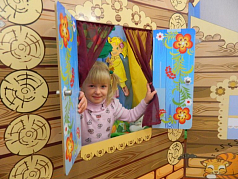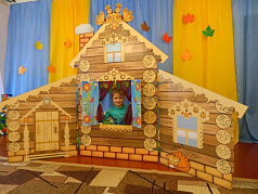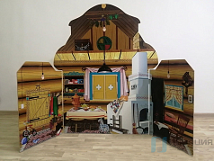 Двусторонняя цветная декорация выполнена в виде избы. На одной стороне размещается изображение фасада избы, на другой - интерьер комнаты. В конструкции есть окно, ставни которого открываются.