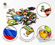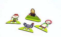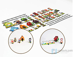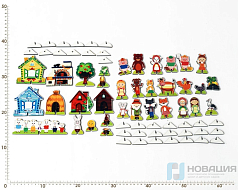 - фигурки (более 21 шт.): волк, 3 поросенка, дедушка, бабушка, внучка, Колобок, лиса, заяц, медведь, курочка Ряба, лягушка, мышка, журавль, бычок, кошка, собака, петух, 7 козлят, коза, подружки.