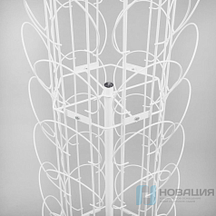 Напольная стойка помогает хранить реквизит в театральных студиях и кружках. Головные уборы или парики надеваются на сдвоенные металлические ободки, которые служат подставками и берегут форму изделия. Перекладины с карманами вращаются вокруг вертикальной оси. Конструкция опирается на 4 ножки. Круглые трубы оснащены заглушками.