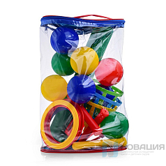 В комплекте: хоккейный набор, жилеты с изображениями видов транспорта, набор для бадминтона, лыжный комплект, шары и кегли, ведро, лейка, жилеты с изображениями дорожных знаков, прочие дидактические материалы.