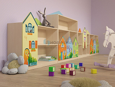Стеллаж для игрушек и пособий декорирован изображениями городских домов. 4 секции состоят из верхних и нижних отделений полуоткрытого и закрытого типа. Вместительные полки комплектуются резными дверцами. Топ служит дополнительной поверхностью для хранения.